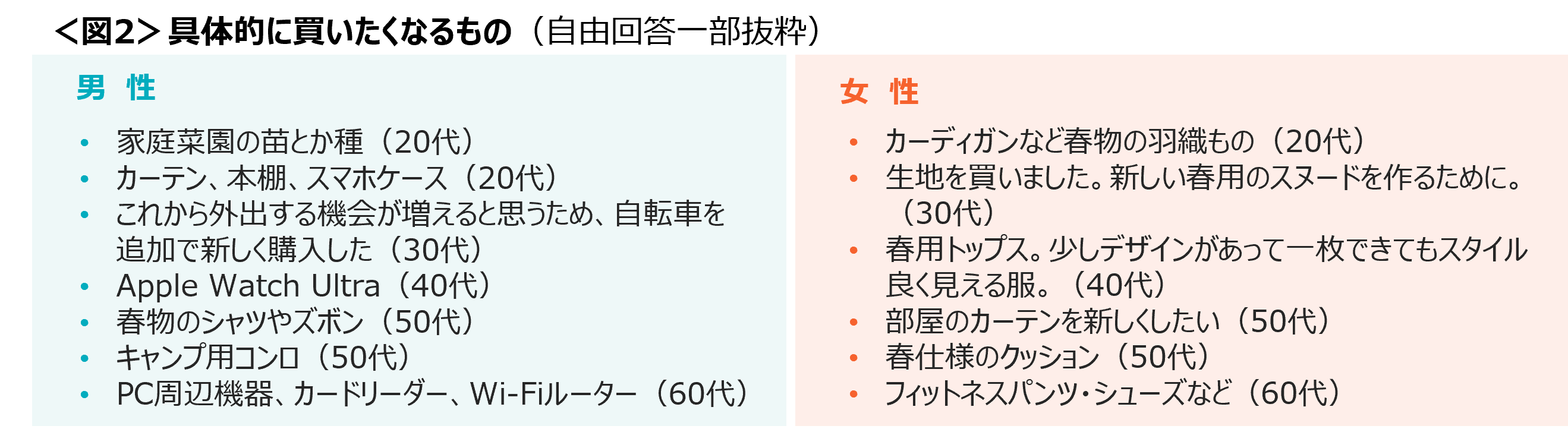 具体的に買いたくなるものは、男性ではApple Watch・春物の衣類・PC周辺機器など、女性はカーディガン・カーテン・クッションなどの声があった。<図2>