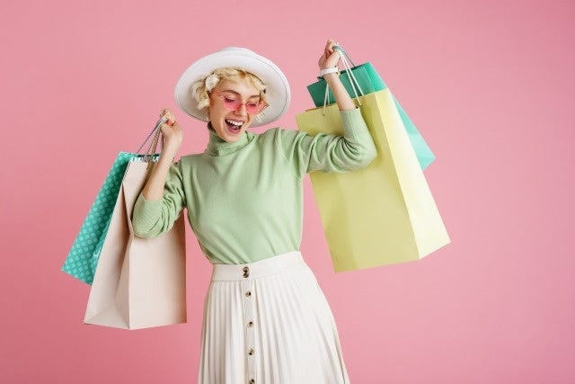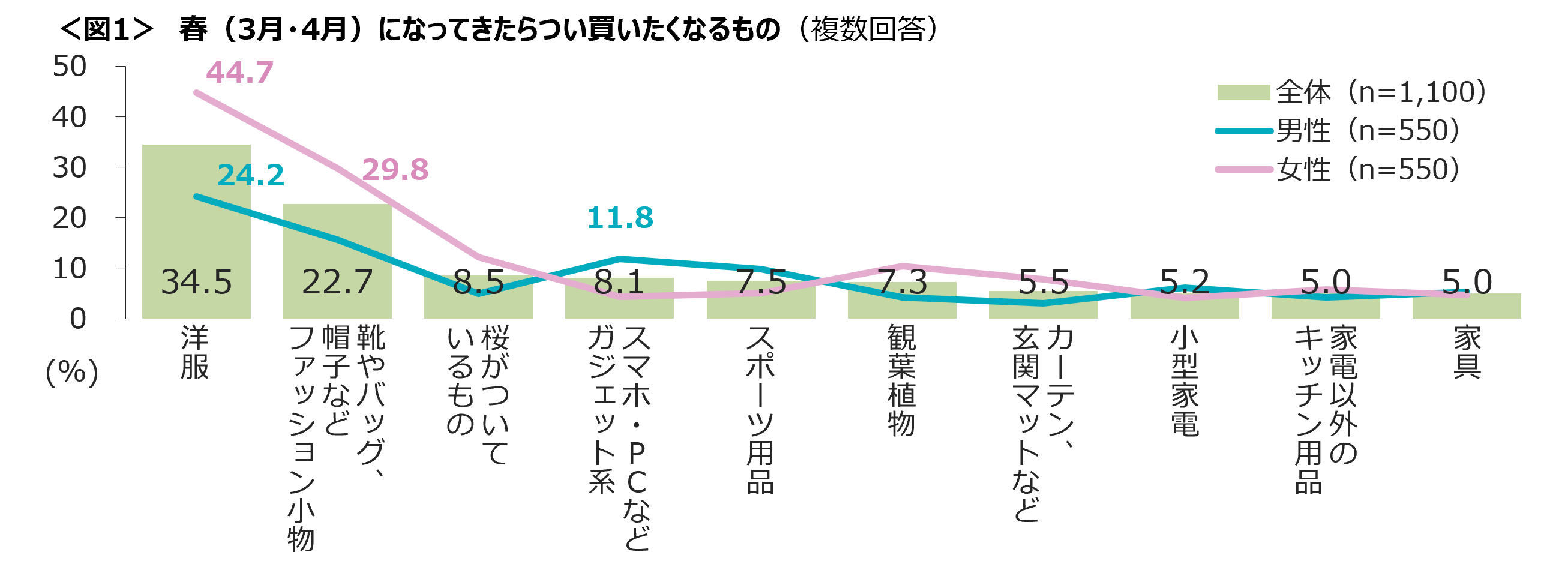 春(3月・4月)になってきたらつい買いたくなるものは「洋服」が最も多く、全体で34.5%。次いで靴やバッグ、帽子などファッション小物が22.7%で続く。<図1>