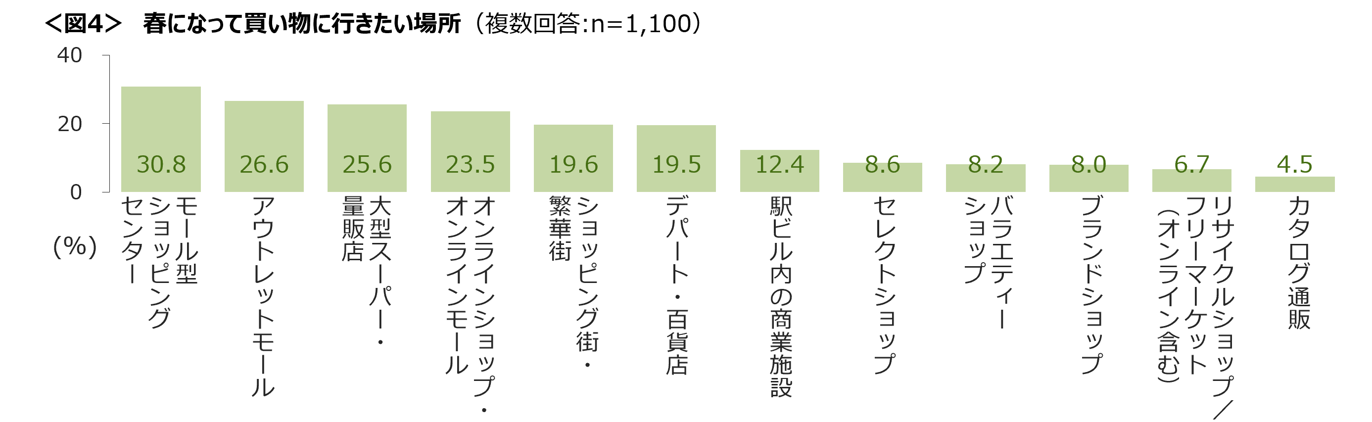 春になって買い物に行きたい場所は「モール型ショッピングセンター」(30.8%)、「アウトレットモール」(26.6%)、「大型スーパー・量販店」(25.6%)がTOP3。<図4>