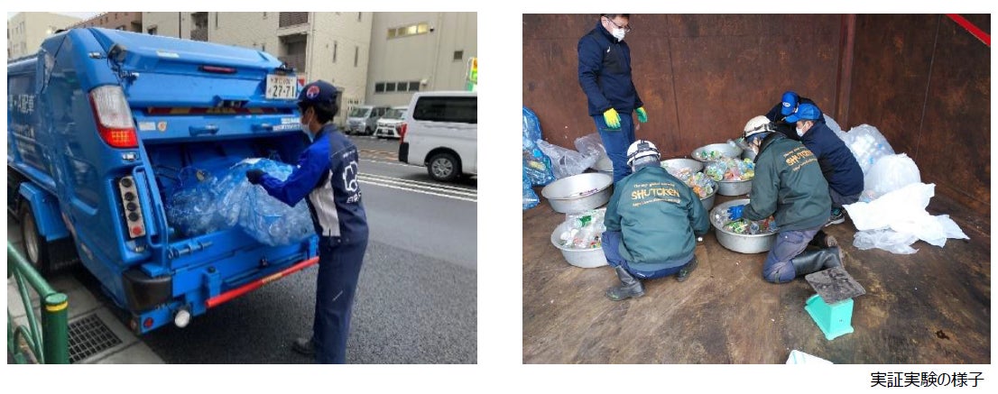 本実験は、本来マンションから廃棄されたペットボトルは主に行政による回収(一般廃棄物)、オフィスビルなどの業務系施設から廃棄されたペットボトルは民間による回収(産業廃棄物)と別々のルートで回収されるものを、一元回収することで運搬時に発生するCO₂の削減、ならびに回収コストの合理化を高める水平リサイクルの展開可能性を検証するものです。