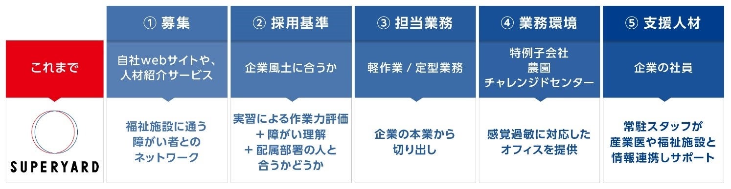 従来の障がい者雇用と以下の5つの点を兼ねそろえている点で新しい手法となっています。