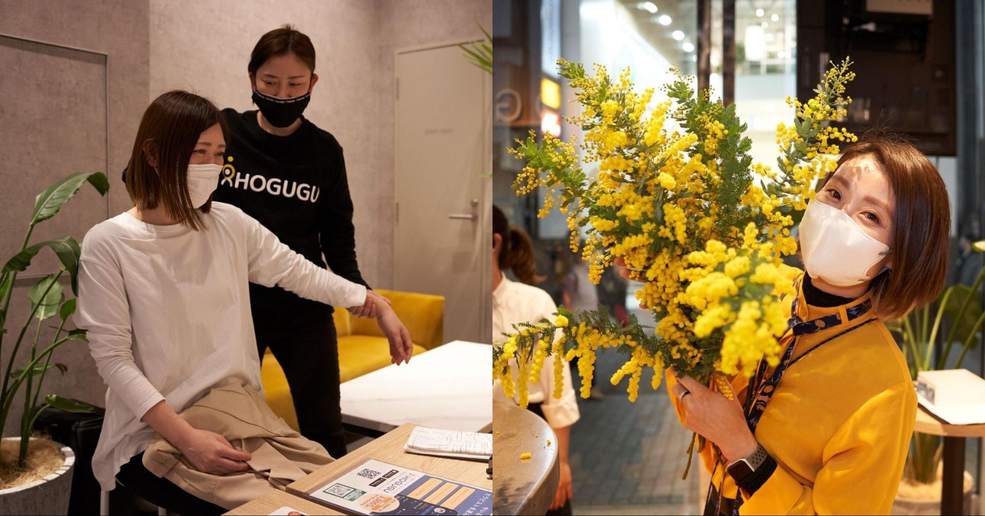 HOGUGU提供 プロの出張セラピストによる、クイック肩揉みマッサージタイムや、よいはな提供の、国際女性デーのシンボル「ミモザのお花」を来場者へプレゼント