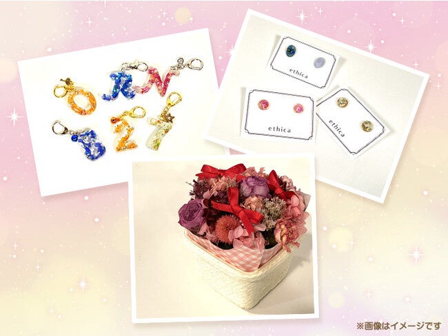 「Show『Flower Puroland』」にも登場するお花屋さんが、実際にお花を購入できるリアルショップとしてピューロランド内に登場します。「エシカルフラワー」で作られたフラワーアレンジメントやピアス(イヤリングも販売)、アルファベットのキーホルダーなどの雑貨からミニブーケも販売予定です。1本からも販売予定ですのでSDGsの目標12「つくる責任 つかう責任」、目標15「陸の豊かさも守ろう」の取り組みにぜひ一緒に参加しましょう。