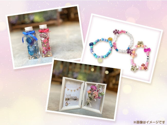 エシカルフラワーを使った、キャラクターをイメージしたオリジナルアイテムを作れるワークショップを開催。ハローキティ、ディアダニエルをイメージしたハーバリウムやマイメロディやクロミをイメージしたフォトフレーム、シナモロールやウィッシュミーメルをイメージしたイニシャル入りブレスレットのアイテムを予定しています。オリジナルアイテム作成後は、キャラクターとの記念撮影タイムも。
