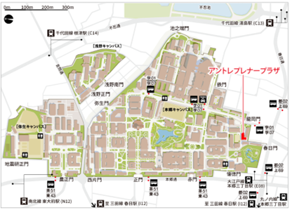 1番出口を出て天神下交差点を右折、春日通りを上り、本郷消防署前交差点の春日門からお入り下さい。
