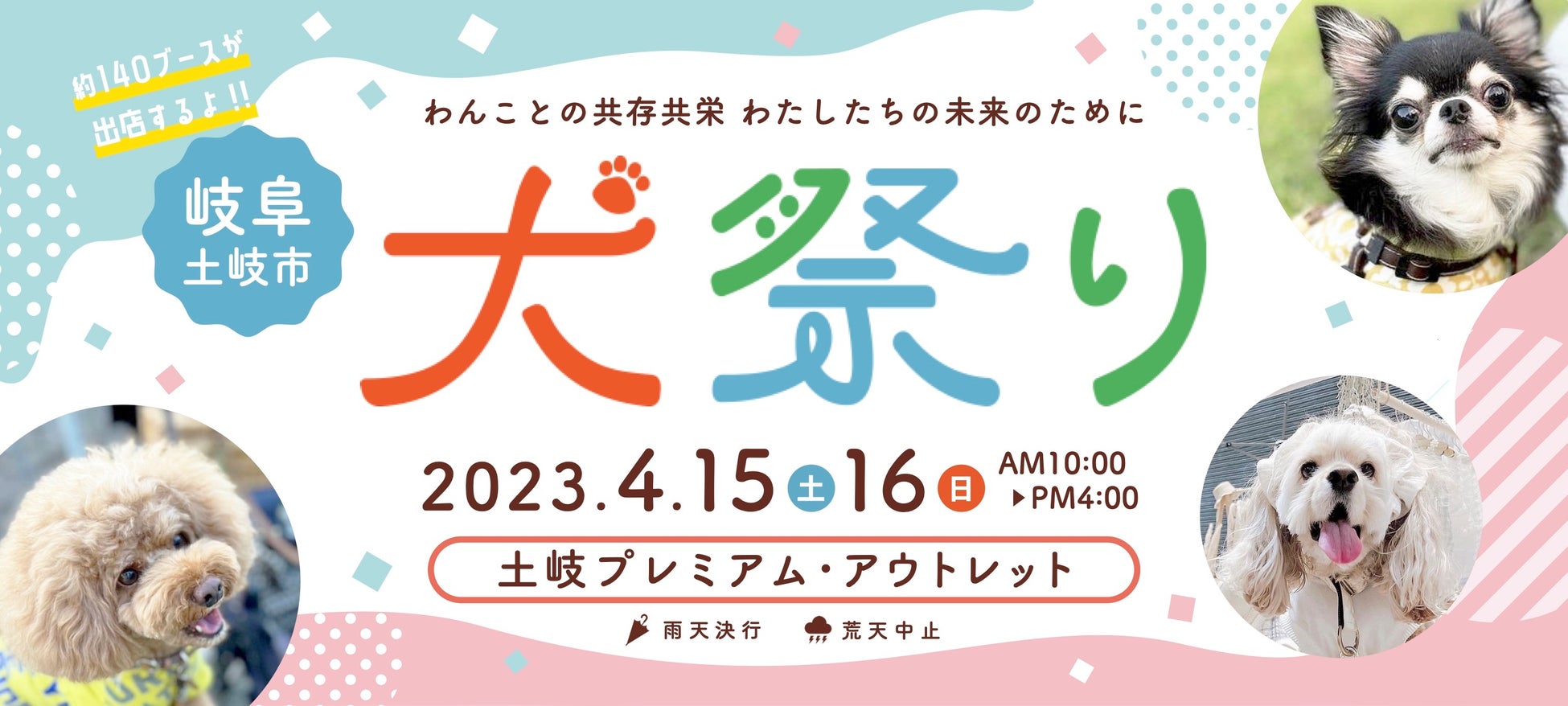 土岐プレミアム・アウトレット(所在地:岐阜県土岐市 / 運営:三菱地所・サイモン株式会社)では、「わんことの共存・共栄 わたしたちの未来のために」をコンセプトとしたペットイベント「犬祭り@土岐プレミアム・アウトレット2023」を4月15日(土)、16日(日)に開催します。