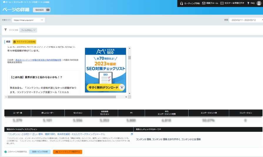 各ページの分析詳細画面では、Google Search Consoleとの連携も加え、インプレッションしているキーワードなどからタイトル・ディスクリプションの改善案も自動で提案されます。