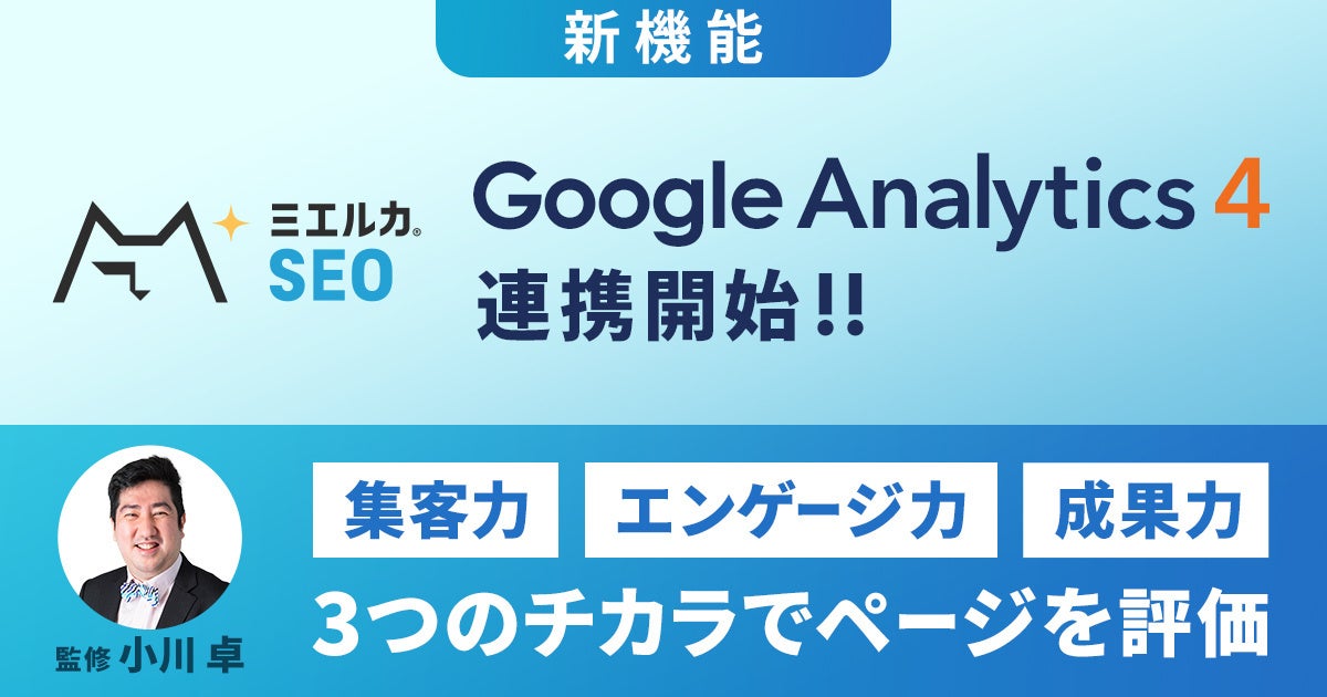 今回、ミエルカSEOに搭載されている「サイトレポート機能」のGA4対応を完了させました。GA4関連の情報発信も積極的にしている当社取締役 CAO 小川卓の監修のもと、同機能で従来から提供していたWebページ改善提案に加え、UIも刷新し、より使いやすくなりました。GA4データを活用したWebサイトの分析・改善を強力にサポートします。