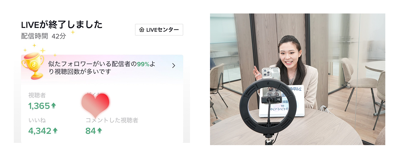 コロナ以降、就活市場も大きく変化しオンライン説明会や面接、採用ブランディングを目的とした動画コンテンツやSNS発信が活発になり、就活生の情報収集源も多様化したように感じました。その中で出会う就活生より「就職相談の相手がいないこと」や「どのようにアドバイスを貰えばいいのかわからない」と悩む声も多くあり、従来の方法以外で機会を作ろうと思ったことがきっかけです。TikTokの特徴である「おすすめ機能」(※1)は、フォロー有無に関係なくユーザーへ発信することができるため、多くの方に手を止めて見て頂くことができるかつ、ライブ配信のためリアルタイムで悩み解決や相談を受けることができることが就活相談とマッチすると考えて開始いたしました。