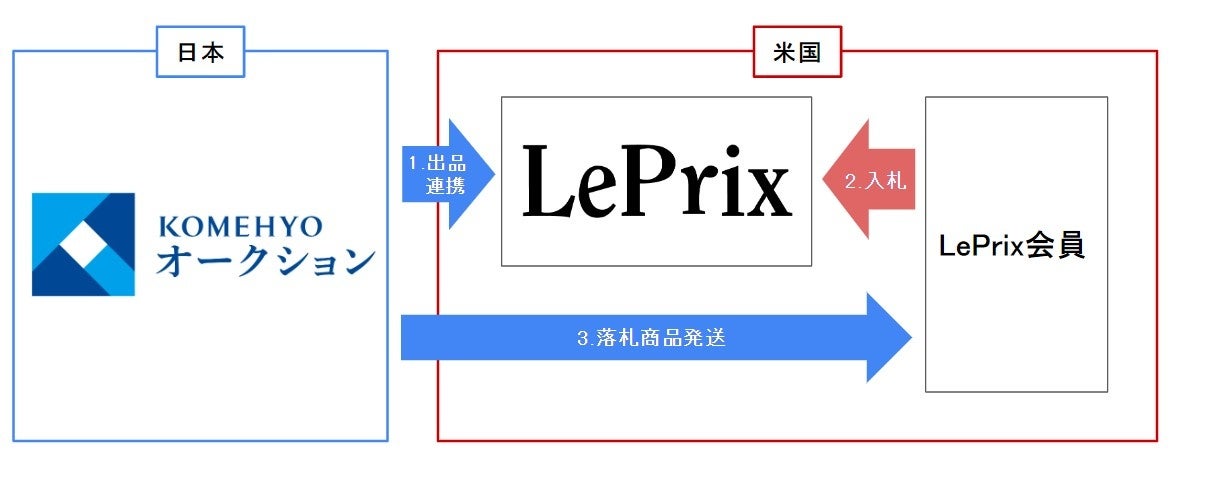 LePrixは、ブランド品のリセールマーケットをオンラインプラットフォームにて運営をしている企業です。毎月の平均掲載商品総額は約8,000万ドルに上り、500社以上の会員が入札に参加しています。KOMEHYOオークションがオンラインプラットフォームとの業務提携するのは初となります。今回の業務提携では、KOMEHYOオークションで出品された商品が同時にLePrixにも出品されるようになりました。米国内500社以上のLePrix会員(中古ブランド品取扱事業者)がKOMEHYOオークションの商品をLePrixのオンラインプラットフォームを通じて入札できるようになります。