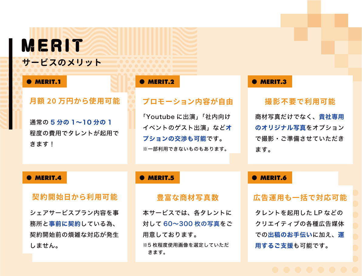 一流タレントの肖像権を複数社でシェアリング活用することで月額20万円からという低価格で活用するサービスです。費用を抑えてタレントを使ったプロモーションを行うことで企業様の認知拡大、ブランディングの確立をすることができます。