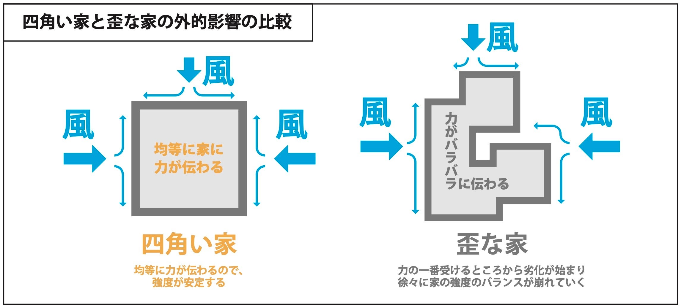 真四角の建物と、歪な形をした建物と比べると、雨風の受け方が箇所によってバラバラな歪な家は、年を経るとどんどん家の強度のバランスが崩れてきて、劣化の原因になります。