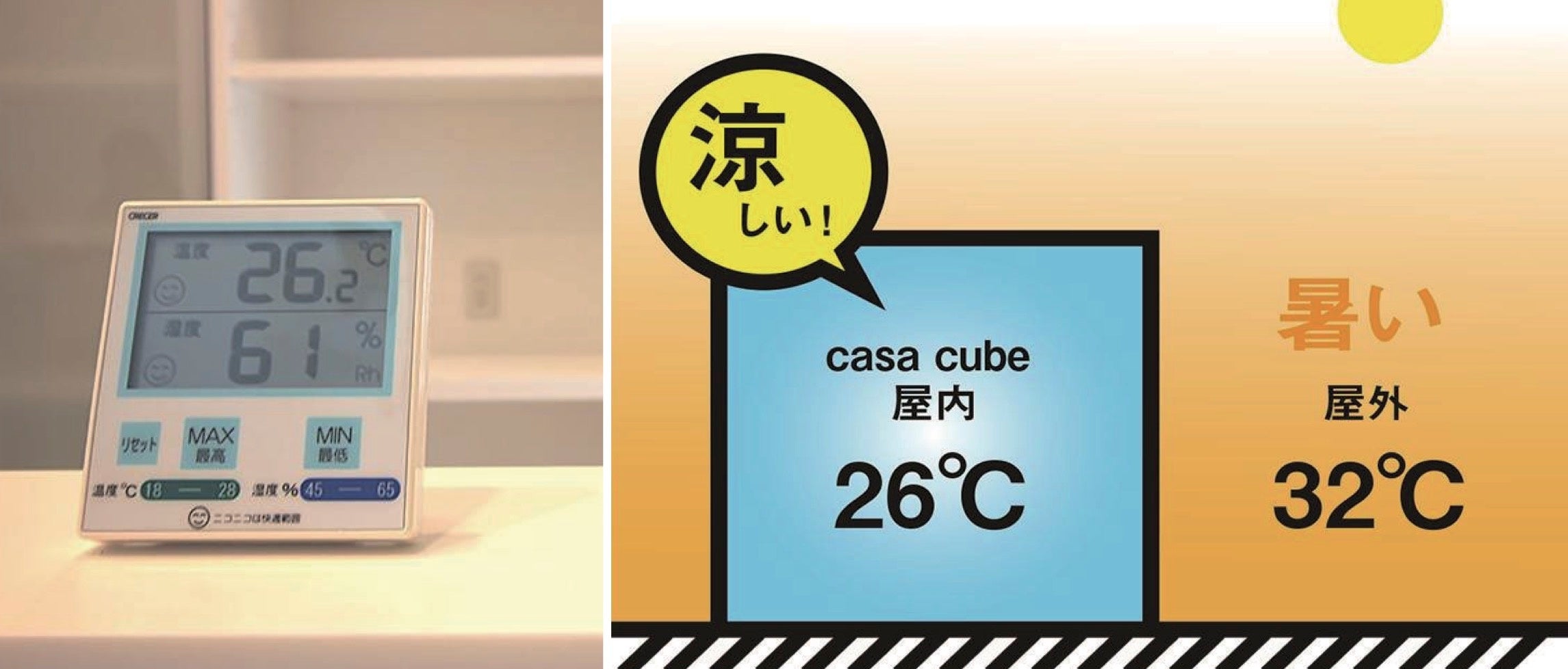 夏の家の熱の73%は、窓から逃げていきます。熱が一番逃げる窓を減らし壁面を増やすことで断熱性を上げて、室内の温度を快適に保ちます。実際に建てたcasacubeで測ってみました。真夏でも、室内温度はエアコンなしで26度です。