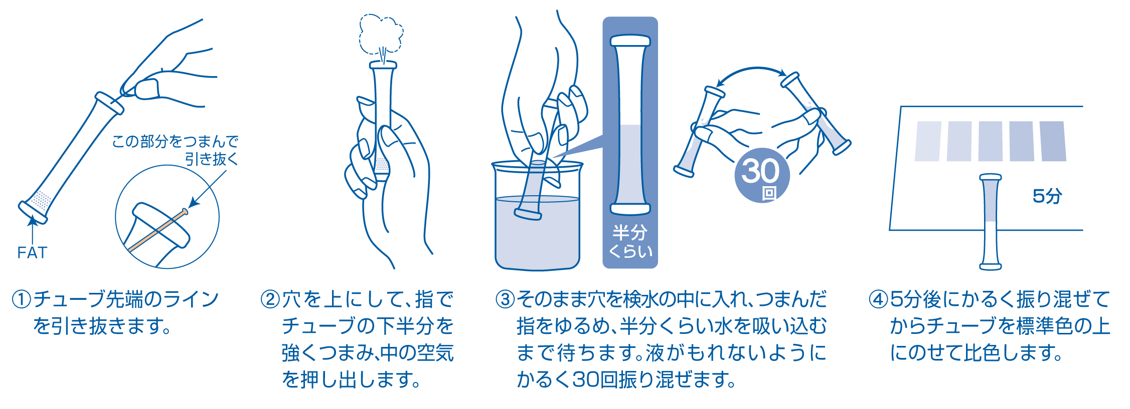吸い込んでチューブを振るだけで測定が可能です。(公定法だと煩雑な操作が必要)