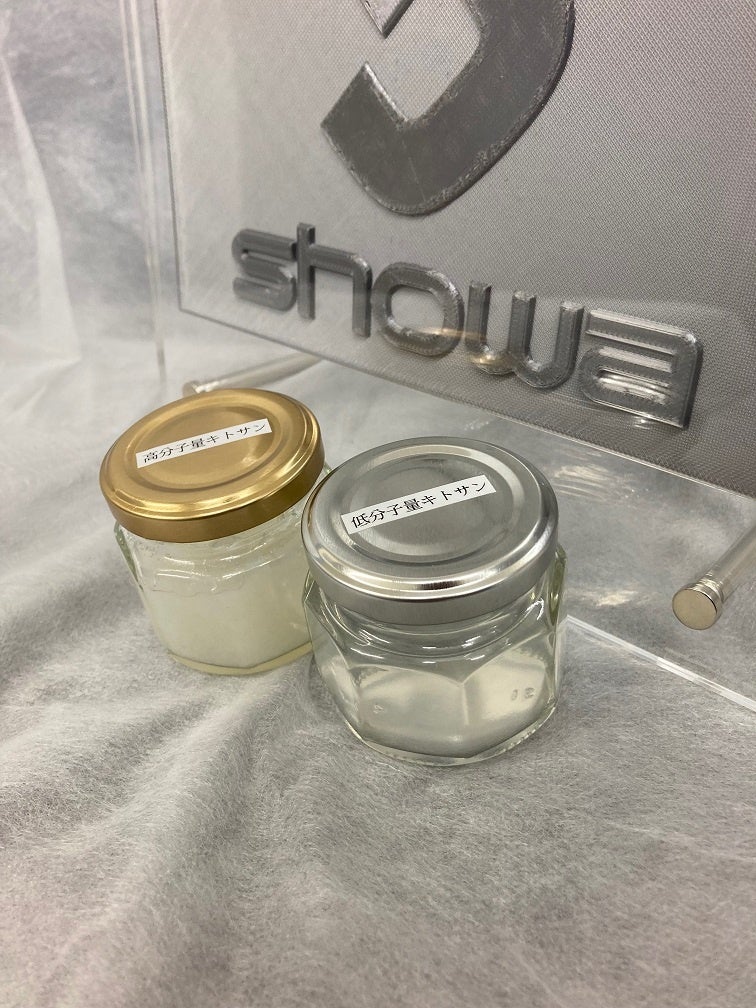 そこで、弊社では北海道大学・戸倉清一名誉教授と共同研究開発の下、キトサンを酸で溶解し、その後アルカリ物質の投入による中性化の過程で、低分子と高分子への“分画”に成功しました。