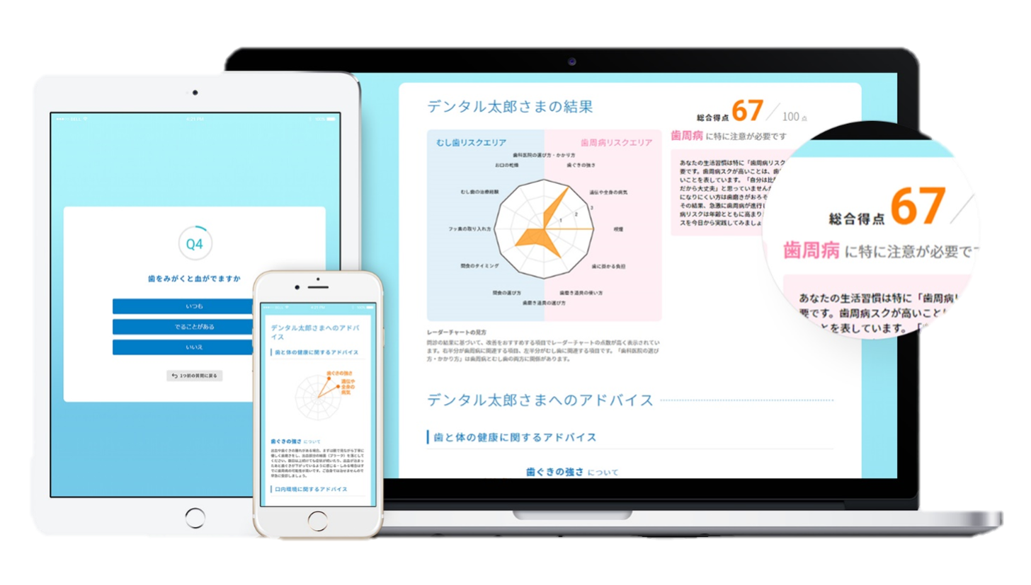 WEB問診で口腔内の状態や、むし歯・歯周病のリスクを評価し、個人に合わせたアドバイスを提供します。リスク状況によっては歯科医院への受診勧奨も提供されるほか、継続的な実施では改善効果の検証も可能です。
