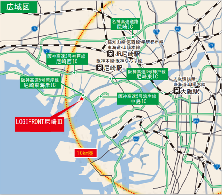さらに、工業専用地域で物流倉庫として優れた操業環境であることなどに着目し、近畿圏全体を網羅する広域配送の物流拠点とすべく、「LOGIFRONT」シリーズとして、本物件とともに「LOGIFRONT尼崎Ⅱ」、「LOGIFRONT尼崎Ⅳ」の計3施設の開発を一体的に進めてきました。