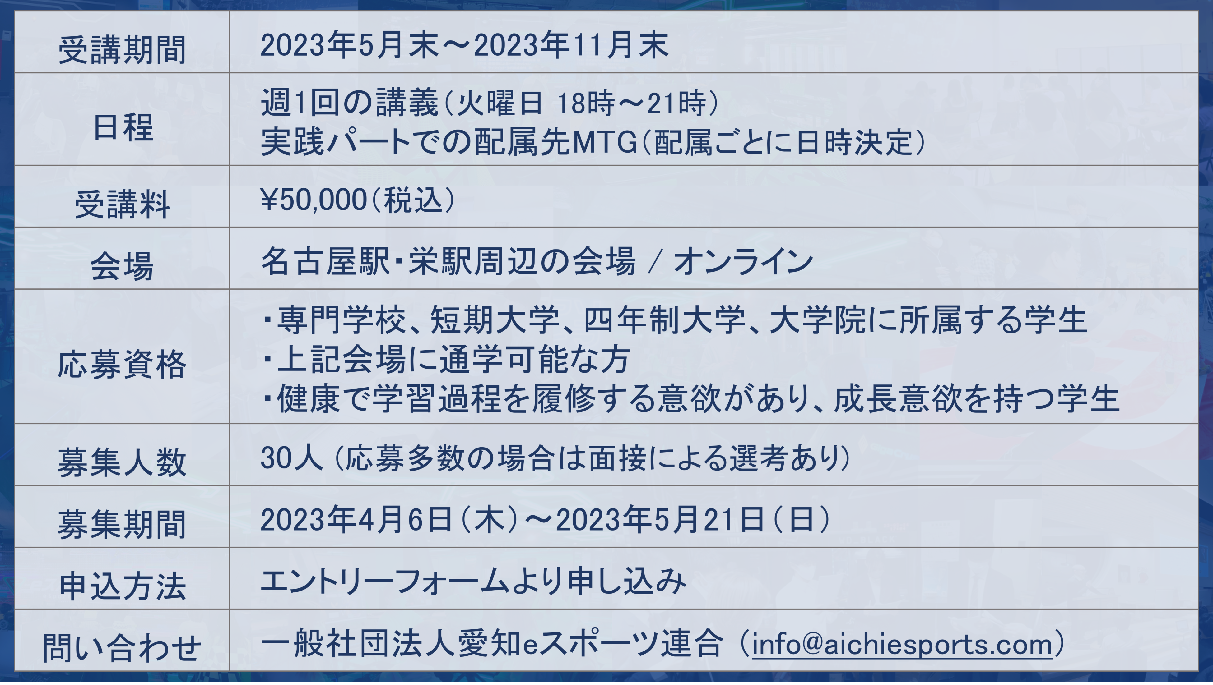 info@aichiesports.com (名古屋・東海スポBizカレッジ運営事務局宛)