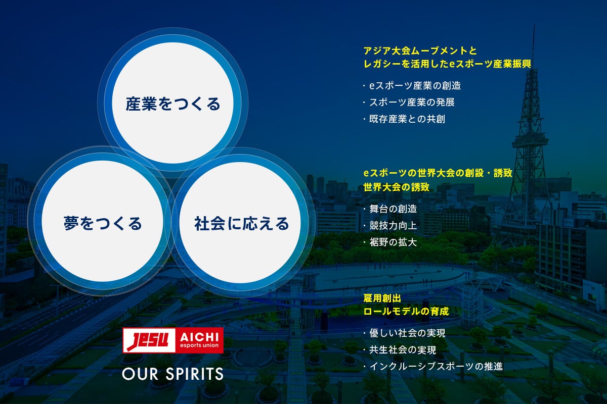 愛知eスポーツ連合は「愛知・名古屋を中心とする地域においてeスポーツを統括し、その普及振興を通して経済社会の発展に寄与する」ことを目指し、2018年2月に前身の愛知県eスポーツ協会から名称変更し、一般社団法人日本eスポーツ連合(JeSU)の地方支部認定をうけました。さらに2019年10月10日に一般社団法人化し、「第20回アジア競技大会2026/愛知・名古屋」の開催をひかえるこの地域において、その種目としての採用が有力な「eスポーツ」とそれをとりまく経済の可能性をお伝えすることで、地域経済発展への寄与を目指して参ります。