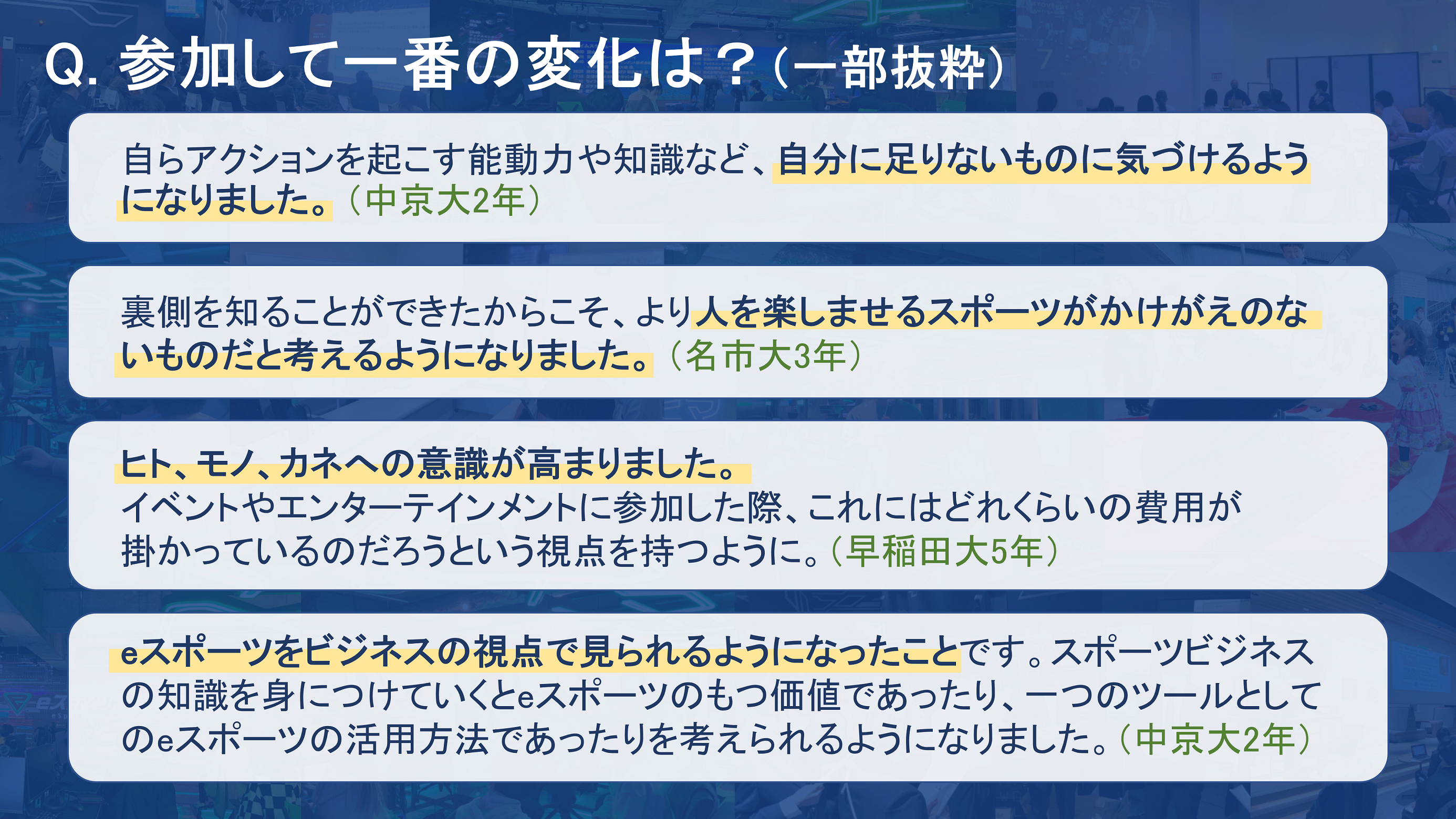 今期はスポーツ業界の枠を超えて、より起業や企業マネジメントに関する学びに力を入れて活動していきます。