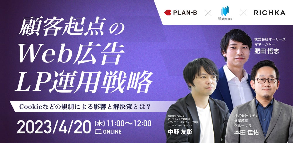 Cookieなどの規制が影響を及ぼし、成果を上げるのが困難な状況にある中、顧客を中心としたWeb広告・LPの運用は不可欠になっています。本セミナーでは、Web広告の運用・広告クリエイティブの運用・LPの運用という3つの視点から、成果改善に欠かせない運用戦略を徹底討論いたします。Web広告やLP運用に悩むマーケターの方は、ぜひご参加ください。