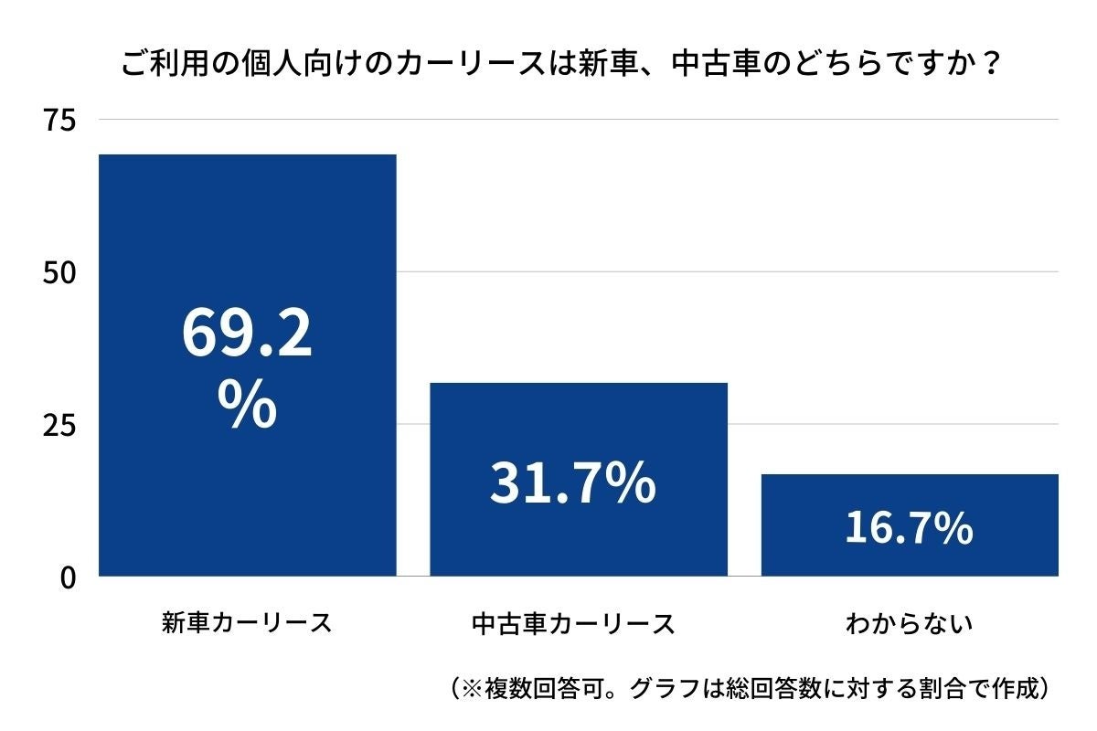 今回、調査に協力してくれたカーリース利用者のうち、「新車カーリースを利用している」という人が69.2%で、「中古車カーリースを利用している」という人は31.7%でした。新車カーリースの方が人気で、新車カーリース利用者が中古車の2倍以上もいらっしゃいました。