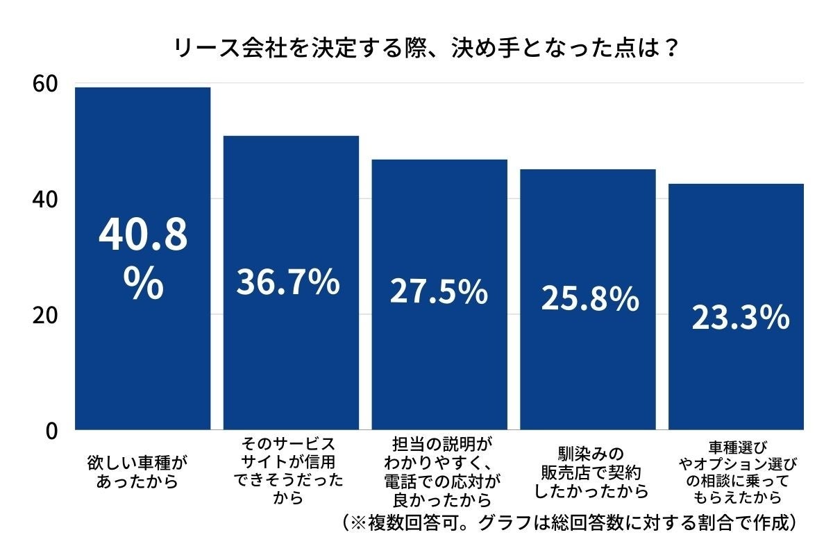1位は「欲しい車種があったから」(40.8%)でした。リース会社によって希望の車種を取り扱っているかどうかは、とても大きな要因であるようですね。