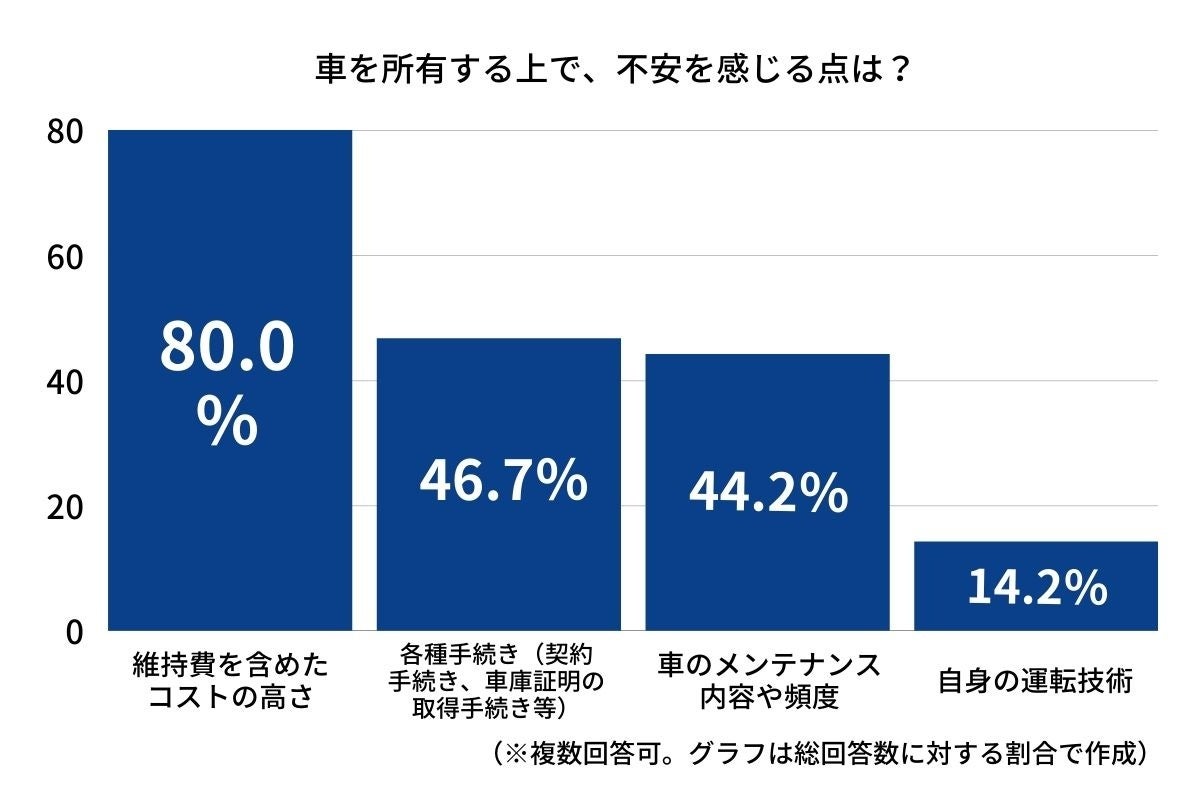 もっとも多くの人が不安を感じると答えたのは「維持費を含めたコストの高さ」で、8割の人がコスト面での不安を挙げています。
