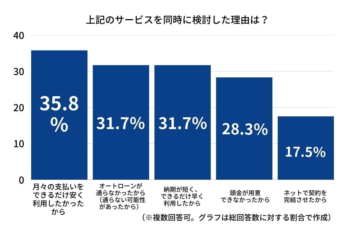 1位は「月々の支払いをできるだけ安く利用したかったから」(35.8%)。続く2位は同率(31.7%)で、「オートローンが通らなかったから」「納期が短く、できるだけ早く利用したいから」という理由であることが判明しました。