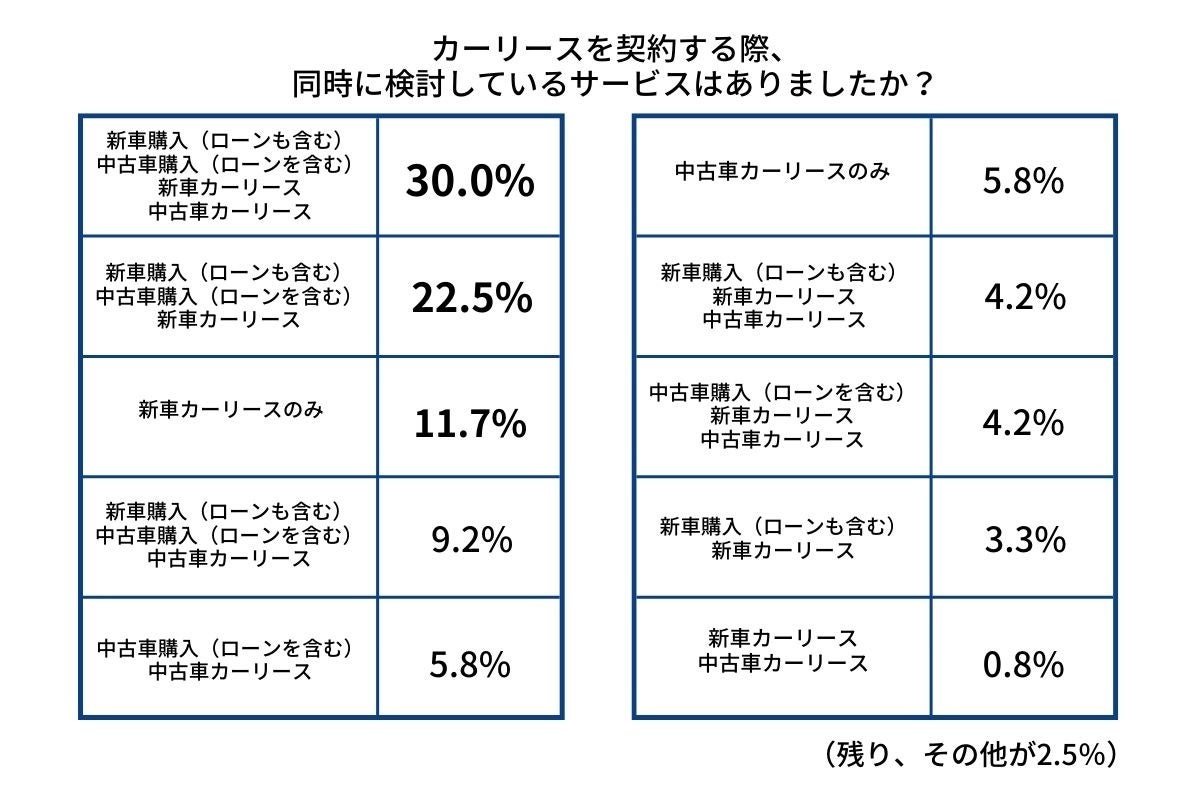 詳細は、上記表を参照していただきたいですが、カーリースというサービスだけを検討した人は「新車カーリース、中古車カーリース」「新車カーリースのみ」「中古車カーリースのみ」と答えた人は18.3%にとどまっています。