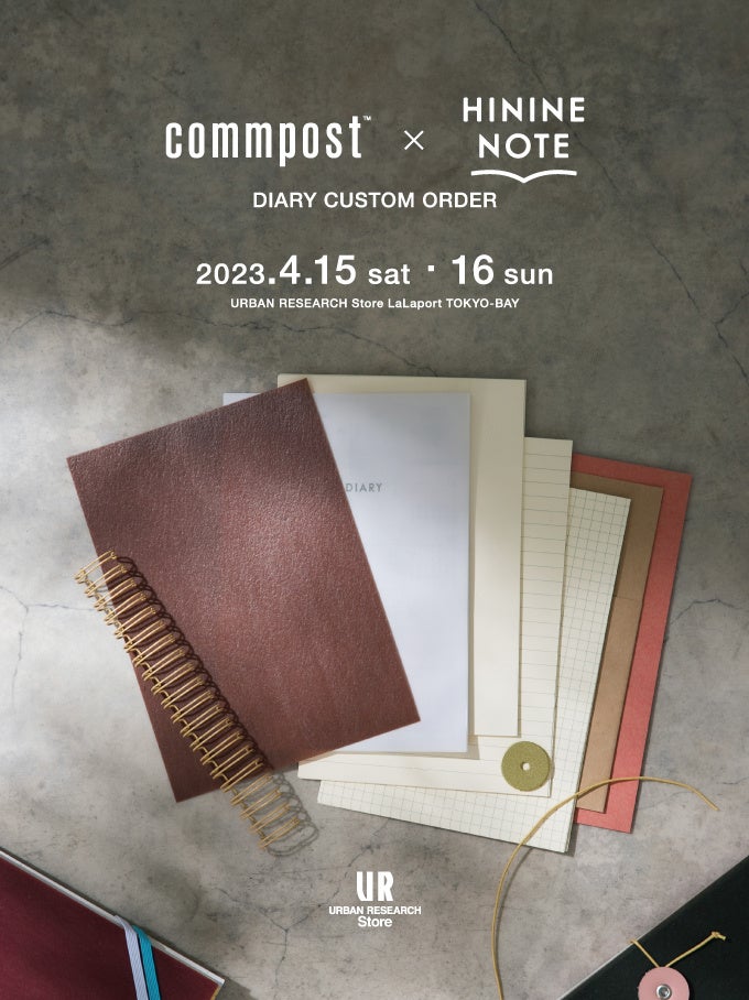 前回同様、期間中はcommpost 生地の表紙(6色展開)のほか、裏表紙、リング、中紙、その他オプションからお好きな色、素材を選んでいただき、ダイアリーやノートをカスタムオーダーしていただけます。当日は、「HININE NOTE」のスタッフさまにお越しいただき、オーダー後その場で製本してお渡しいたします。(オーダー後、1冊約15分で作成。)