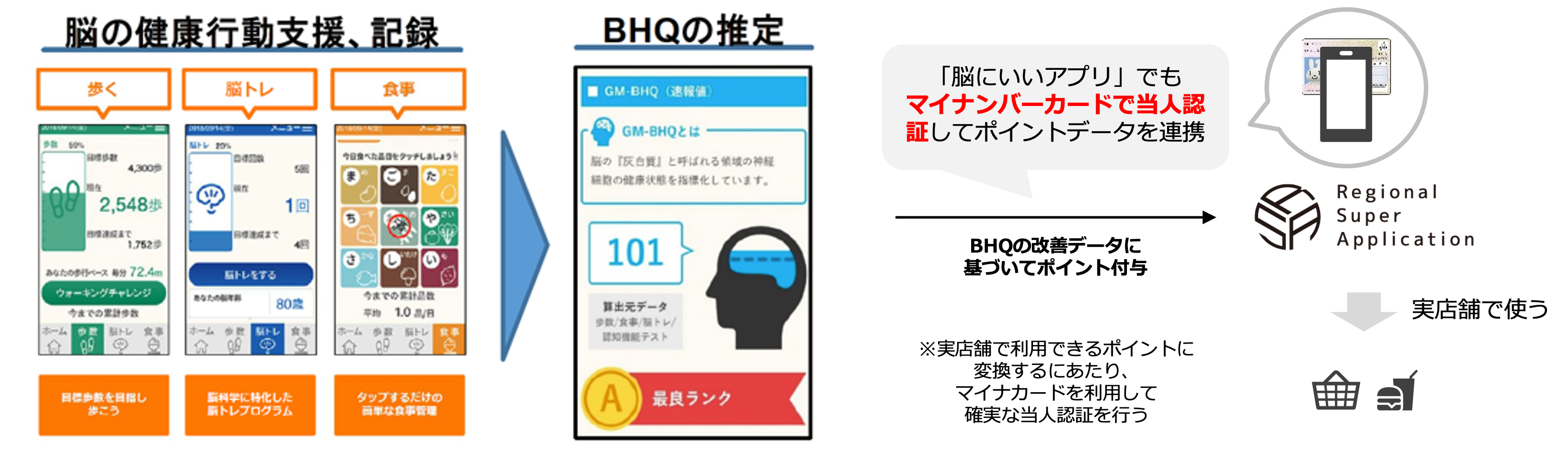 アプリを用いて歩数や脳トレ結果、脳にいい食品目の摂取といった健康行動の支援を行い、この行動記録から脳の健康管理指標である「BHQ(Brain Healthcare Quotient)」を推定、アプリ上で利用者にフィードバックします。このフィードバックに加え、さらに利用者の健康行動を支援する為に、利用者IDにマイナンバーカードで本人認証をしたデータ連携基盤IDを用いることで、BHQの数値改善に応じて地域ポイントの発行を行います。