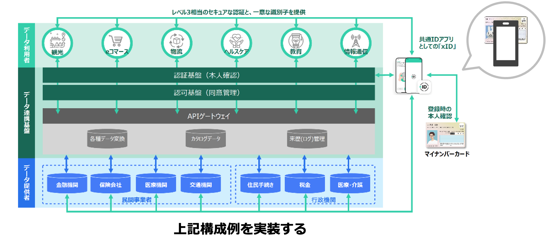 データ連携基盤にマイナンバーカードを活用した本人確認の認証基盤として、デジタルIDアプリ「xID」を組込みます。