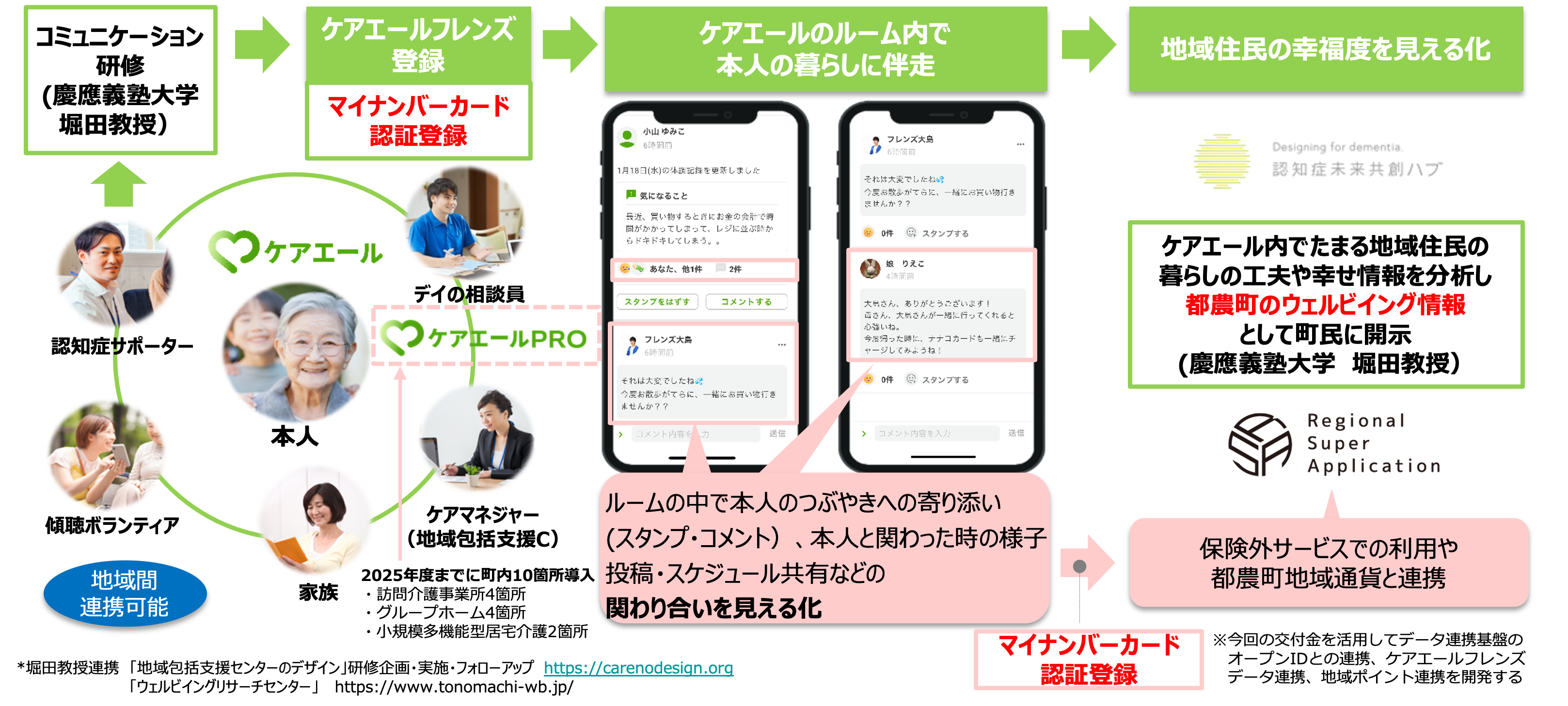 「ケアエール」の活用と「ケアエールフレンズ」の仕組みの構築にあたり、慶應義塾大学健康マネジメント研究科堀田聰子教授に「ケアエール」上で蓄積されていくデータを基にした町民のウェルビーイング分析と「ケアエールフレンズ」養成の為のコミュニケーション研修の実施を委託します。