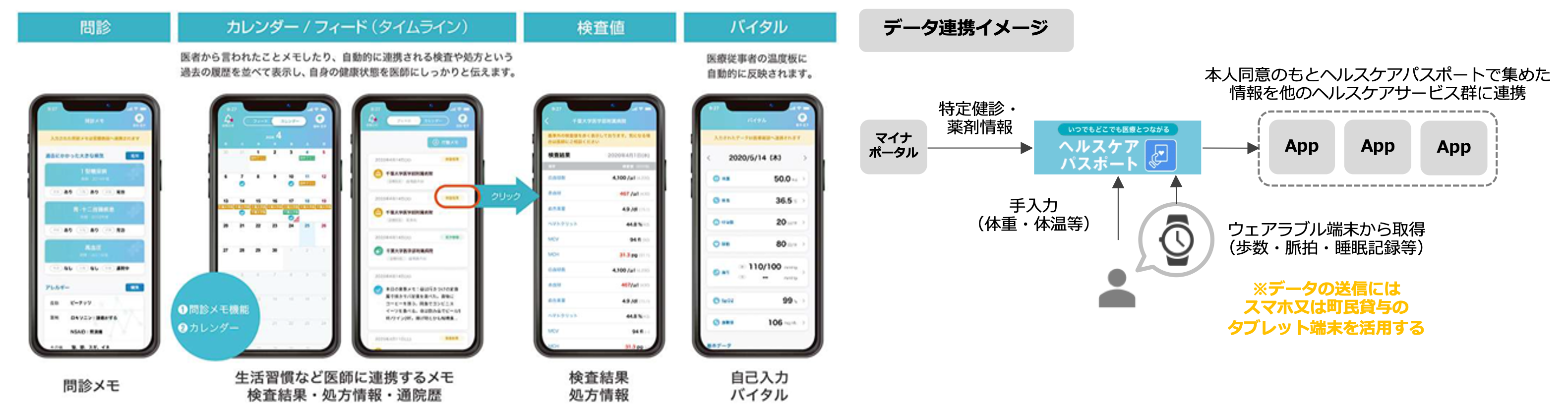 医療保険情報取得APIを活用し、マイナポータルから自己情報(特定健診・薬剤情報)を収集する他、ヘルスケアサービス群を利用する町民の一部に貸与するウェアラブル端末からバイタルデータを収集することにも活用します。