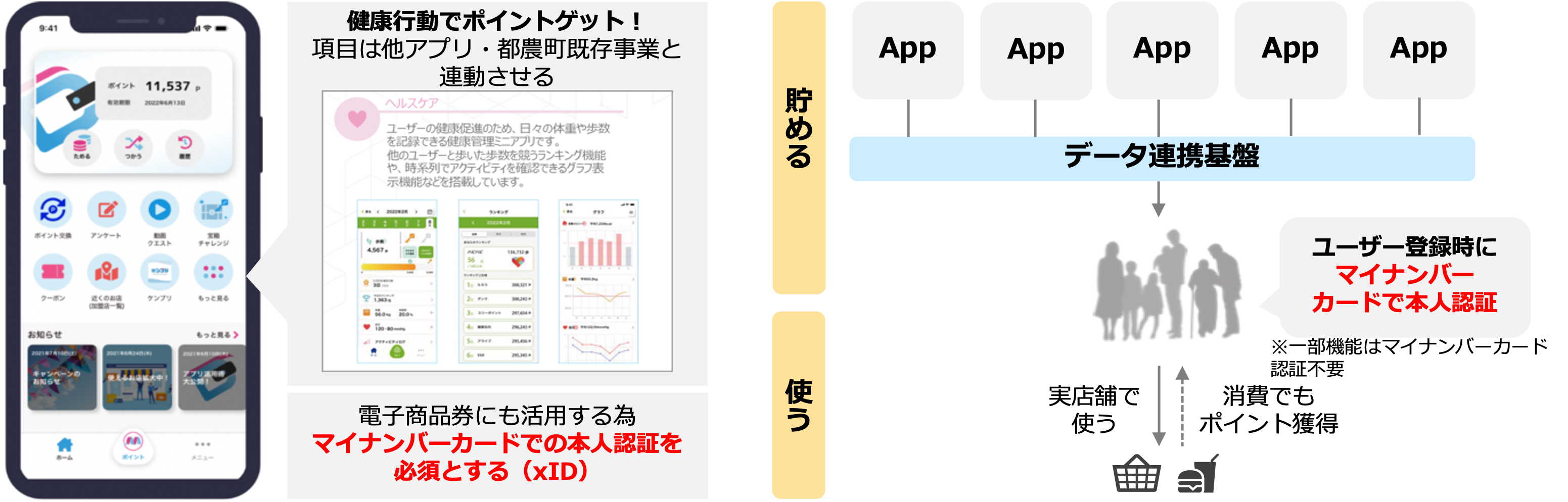 町内の小売店・飲食店等の実店舗で支払いに利用できるのはもちろん、データ連携基盤に接続されたサービス(アプリ)の利用に合わせてポイントを付与する仕組みを構築し、各サービスの利用を促す仕掛けとします。