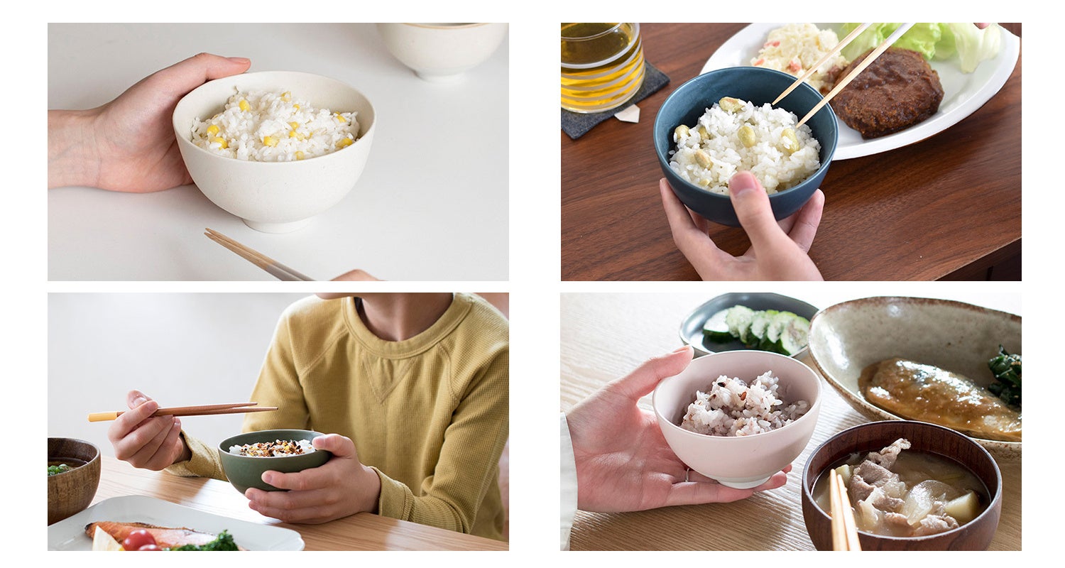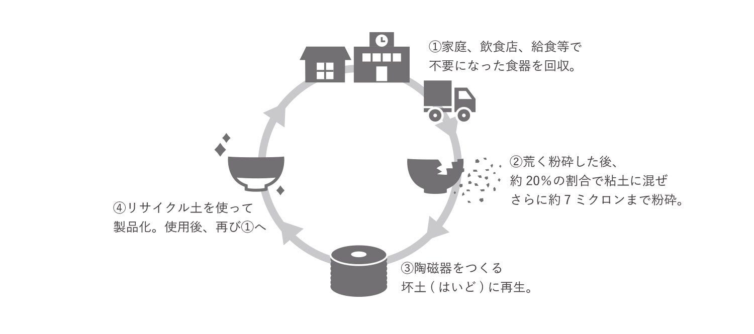 家庭や飲食店、給食で不要になった食器を回収、粉砕してお茶碗のボディに使用することで、