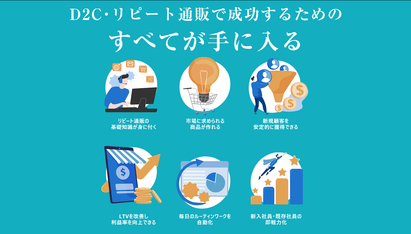 サブスクD2C(リピート通販)に関する基礎から最先端のノウハウまでを学ぶことができます。
