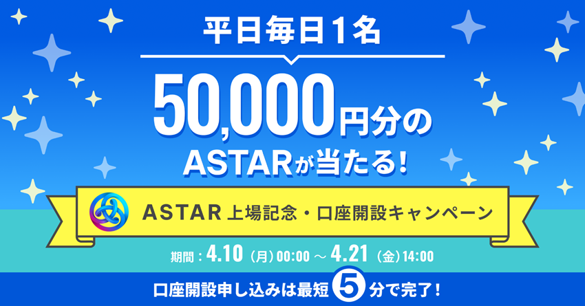 キャンペーン期間中に口座開設(KYC 審査通過)完了されたお客様の中から平日(土日を除く)毎日1名様を抽選し、50,000円相当の ASTAR をプレゼントいたします。