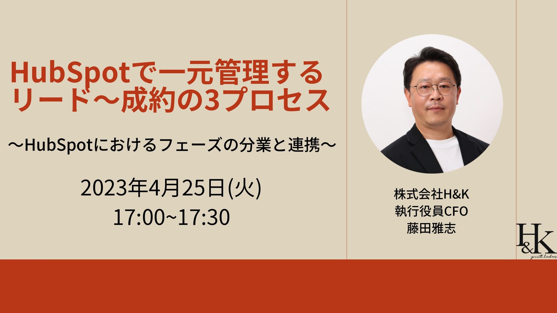 ■企業のマーケティング、DX化などの支援を行う株式会社H&K(本社:神奈川県横浜市、支店:東京都新宿区、代表取締役CEO:安藤弘樹)が、2023年4月25日(火)に、「HubSpotで一元管理するリード〜成約の3プロセス」について語るウェビナーを開催することとなりましたので、ご案内いたします。