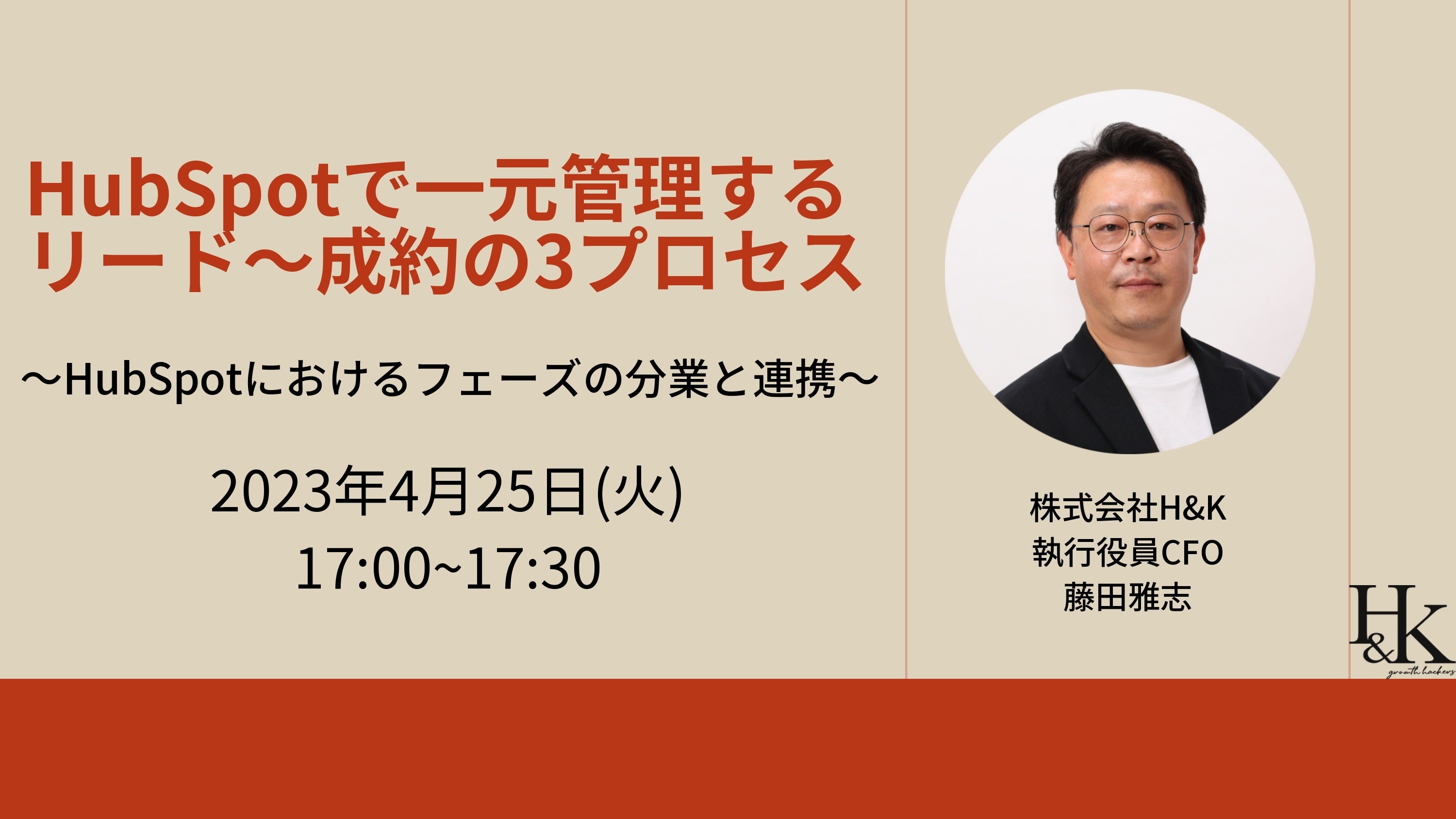 2023年4月25日(火)17時00分〜17時30分でZOOMにて「HubSpotで一元管理するリード〜成約の3プロセス」について語るウェビナーを開催いたします。