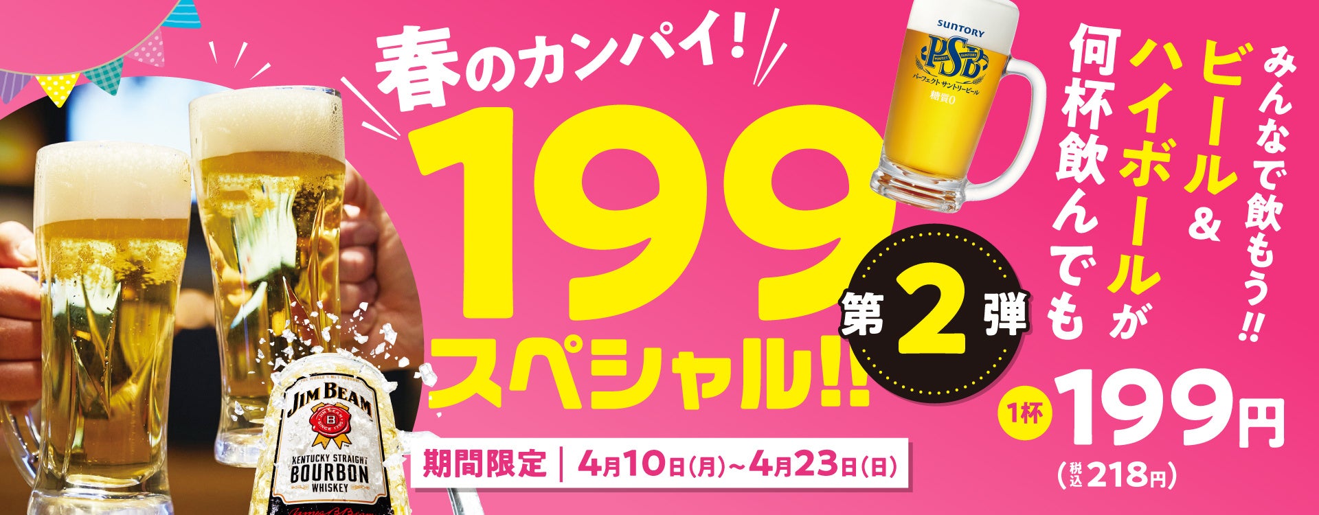 2023年3月13日(月)よりマスク着用に関する方針の発表を受けて実施しました、「春のカンパイ!199スペシャル!」のご好評を受けて、新生活の始まりに新たな友人や仲間同士と共に外食をしながら話をして明るい新年度スタートのきっかけを提供できればと、第2弾となる今回は2023年4月10日(月)から4月23日(日)までと開催期間を延長して、ビール、ハイボール各種を何杯飲んでも1杯税込218円のスペシャル価格で提供いたします。