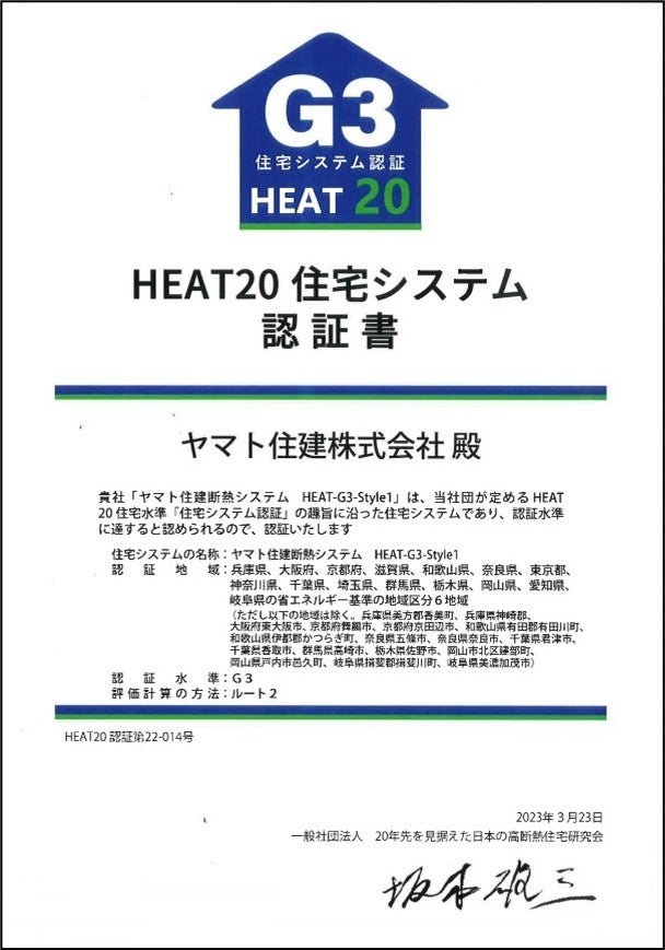 注文住宅を手がけるハウスメーカーのヤマト住建株式会社(本社:兵庫県神戸市、代表取締役:中川 泰、以後「ヤマト住建」)は、HEAT20・G3グレードの「住宅システム認証」を取得しました。