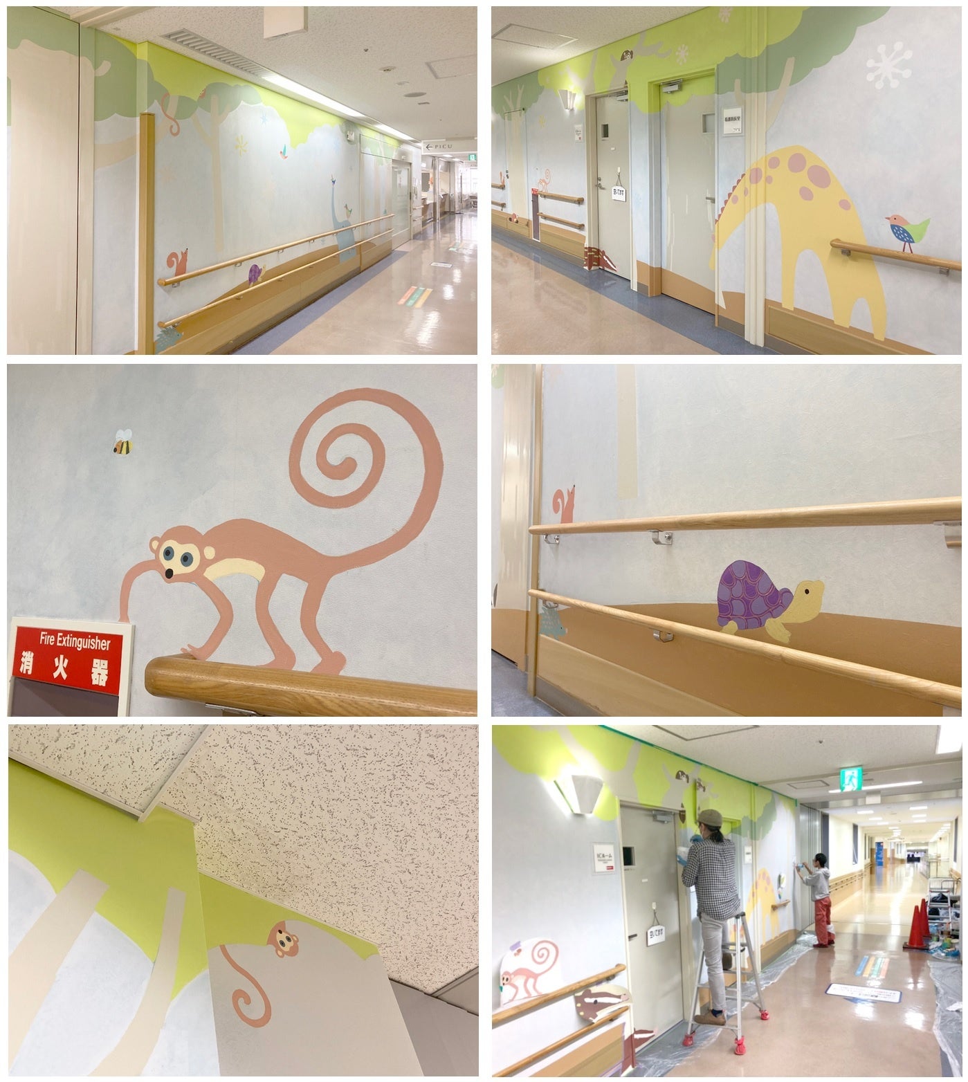 小児患者さんが、病室から手術や検査・治療に行く際の動線になる場所であることから、闘病中で外出できず辛い思いをしていたり、検査に向かう不安な気持ちのお子さんたちに、少しでも気分が晴れて元気になれるようなデザインを依頼したところ、ゾウ・キリン・テナガザル・リクガメ・リス・ハリネズミ・カメレオン・アリクイ・モグラなどの動物と樹木をモチーフにしたデザインを考えてくださいました。