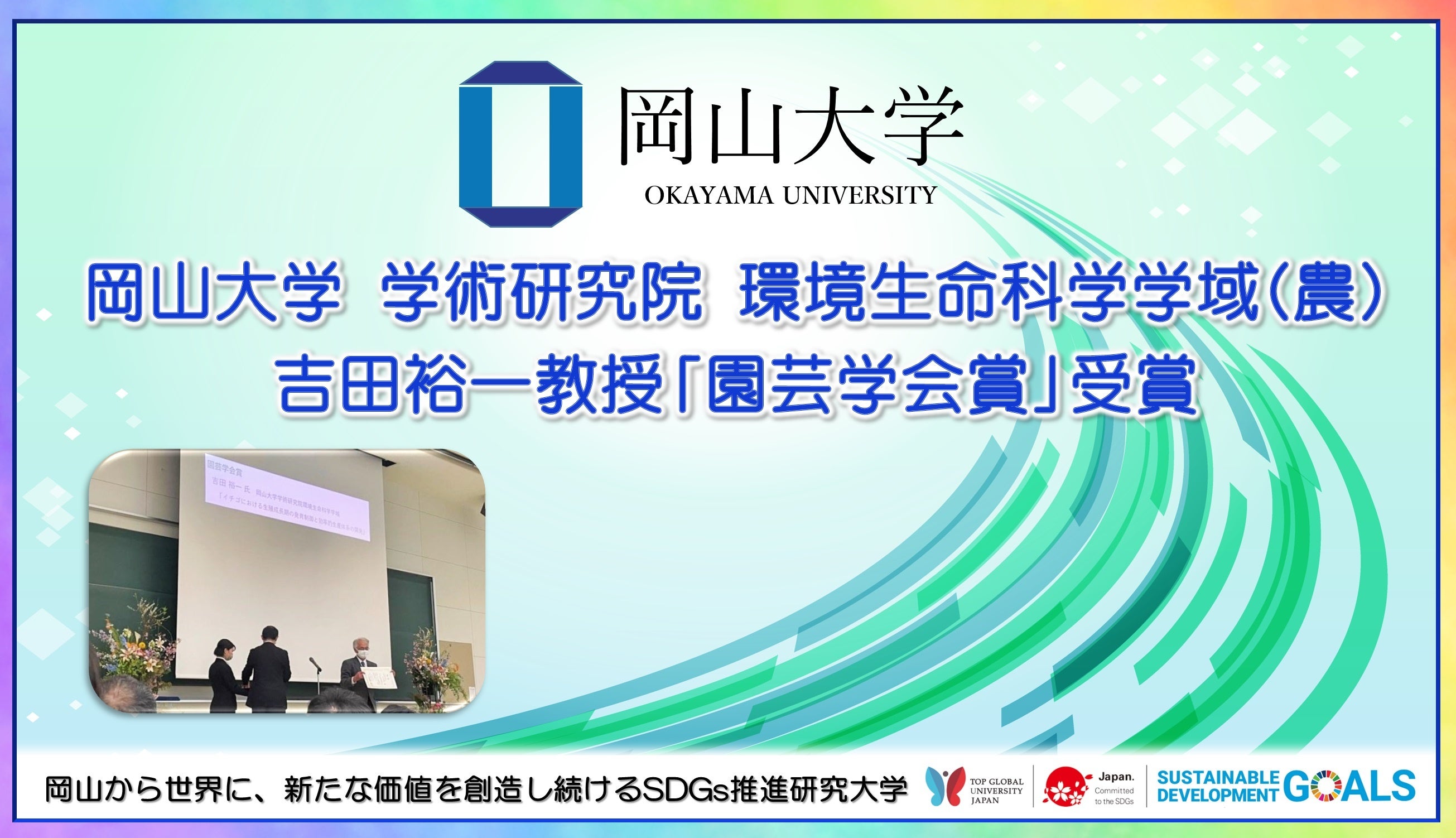 国立大学法人岡山大学(本部:岡山市北区、学長:那須保友)学術研究院環境生命科学学域(農)の吉田裕一 教授が、2023年3月19日に、龍谷大学において開催された一般社団法人園芸学会 春季大会にて、「イチゴにおける生殖成長期の発育制御と効率的生産体系の開発」の業績により、園芸学会賞を受賞しました。