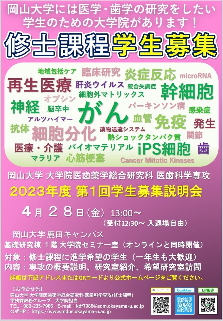 国立大学法人岡山大学(本部:岡山市北区、学長:那須保友)大学院医歯薬学総合研究科・医歯科学専攻(修士課程)では、2023年4月28日(金)13:00から「2023年度第1回学生募集説明会」を本学鹿田キャンパス(岡山市北区)での現地開催とオンライン開催の同時にて実施します。