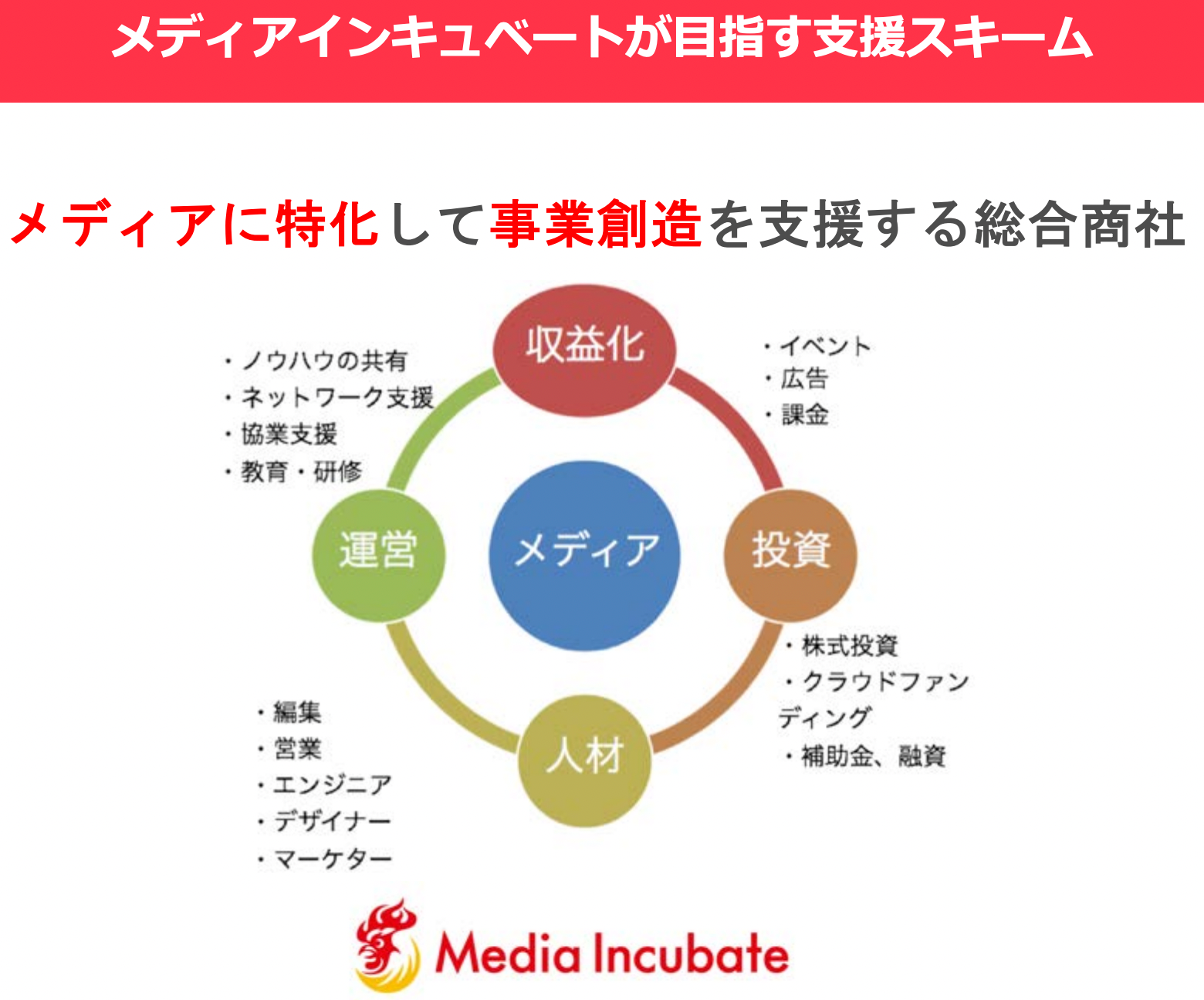 メディアインキュベートでは、メディアに強みを持ち、総合的に事業創造のサポートを目指しています。