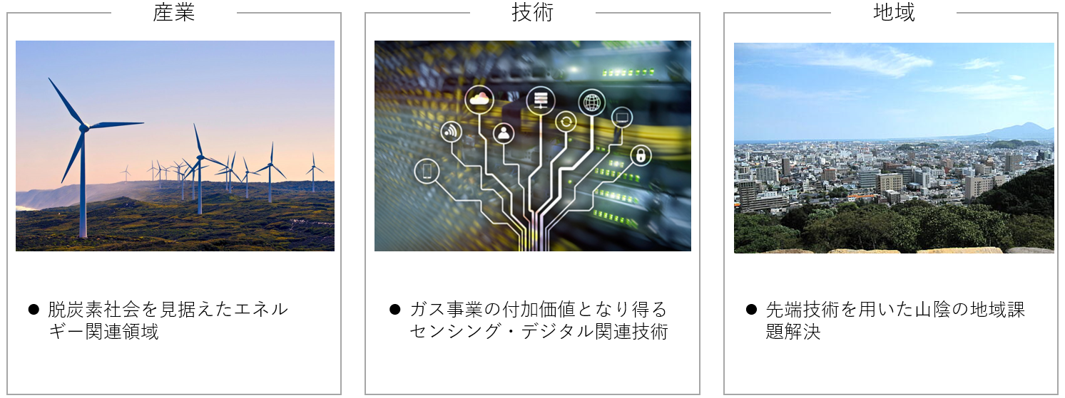 当社を中核とする山陰酸素グループは、2032年にむけた長期ビジョンとして、働く人と地域に新たな価値を提供し循環させる『「幸せをめぐらせるグループ」になる。』ことを掲げています。ビジョン実現に対しバックキャストし、既存エネルギー関連事業への強化とリソースを活かした新規事業創出が可能なベンチャー企業を投資対象と設定します。