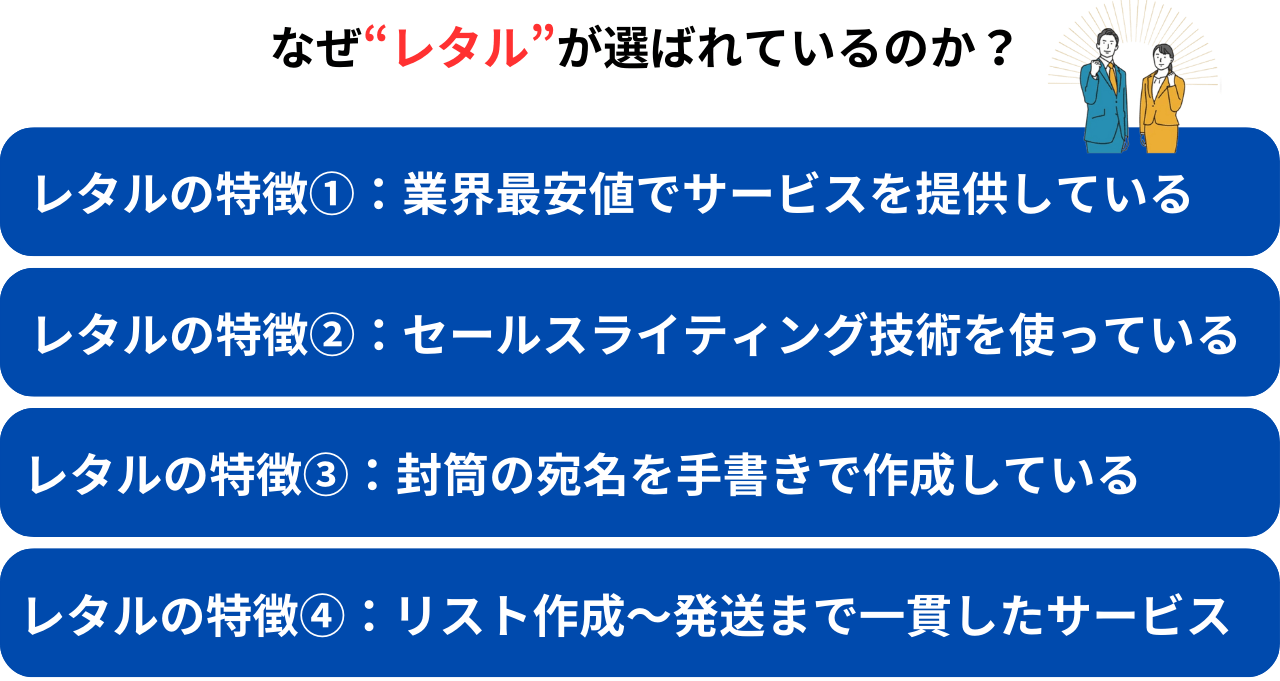 手紙営業代行サービス“レタル”が、営業でのお悩みをすべて解決いたします。
