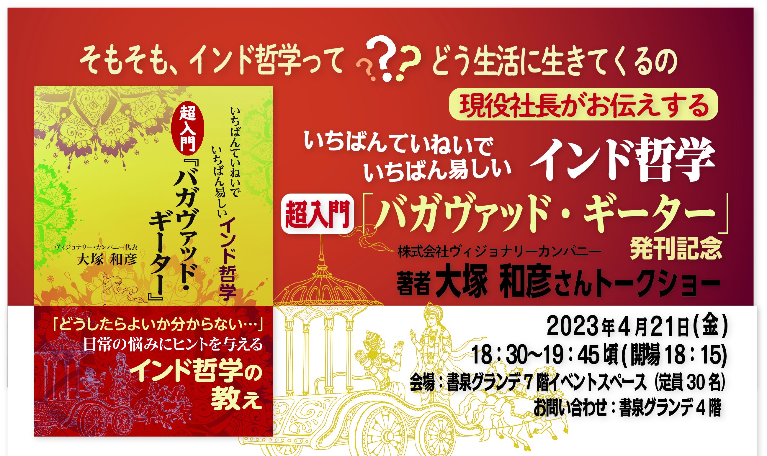 『いちばんていねいでいちばん易しいインド哲学 超入門『バガヴァッド・ギーター』』の発刊(4月12日)を記念し、著者の大塚和彦さん(株式会社ヴィジョナリー・カンパニー代表取締役)によるトークショーを開催いたします。 難解でとっつきにくいインド哲学について、「インド哲学とはそもそも何?」、「日常生活でどのように役立つの?」という点に絞って、初めての方にも分かりやすくお話しいたします。